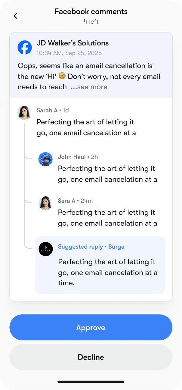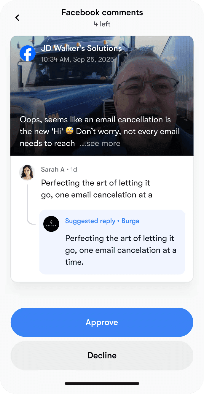 Type a prompt, approve a draft, and get real work done. Edit in-line and schedule across channels in seconds.