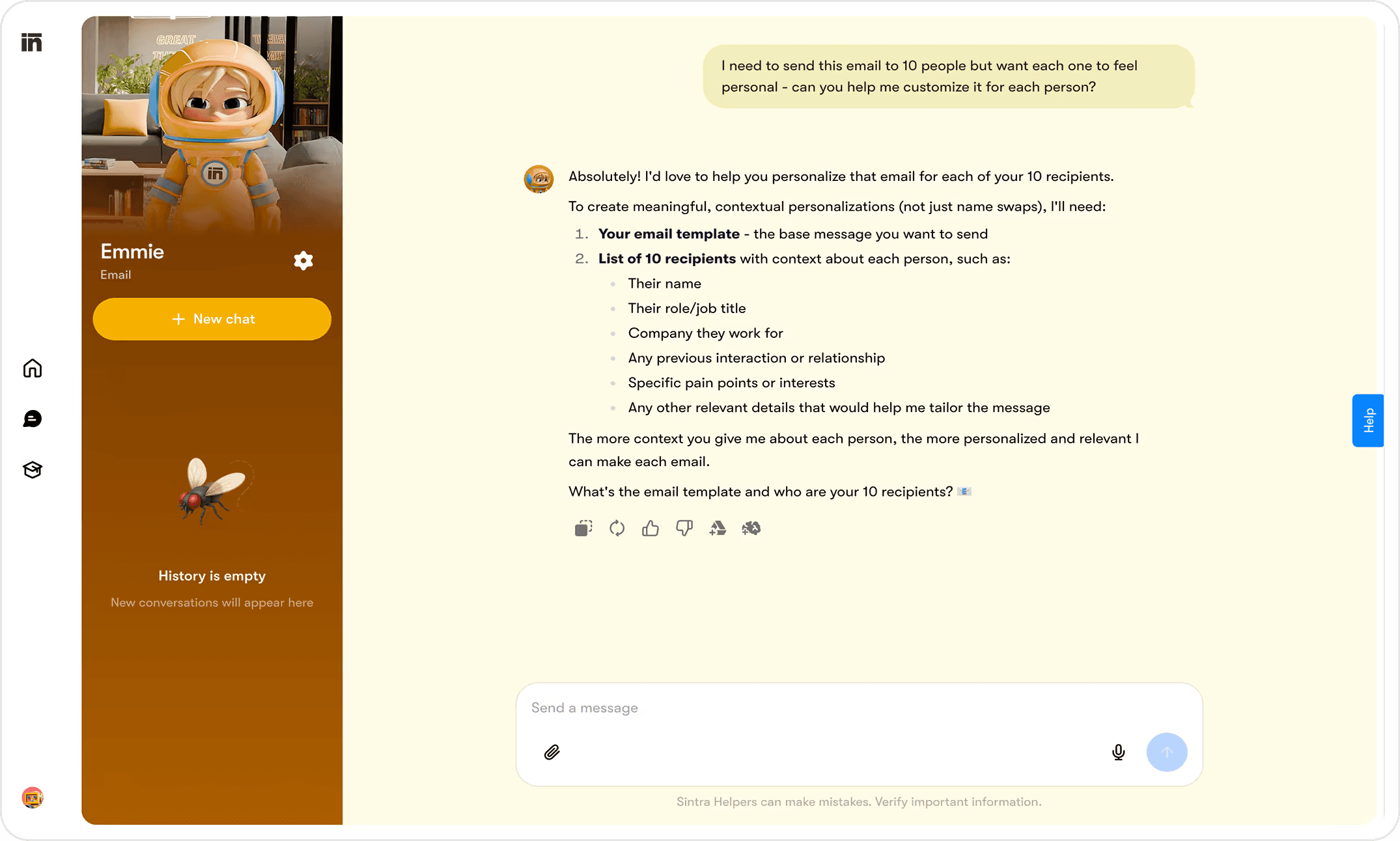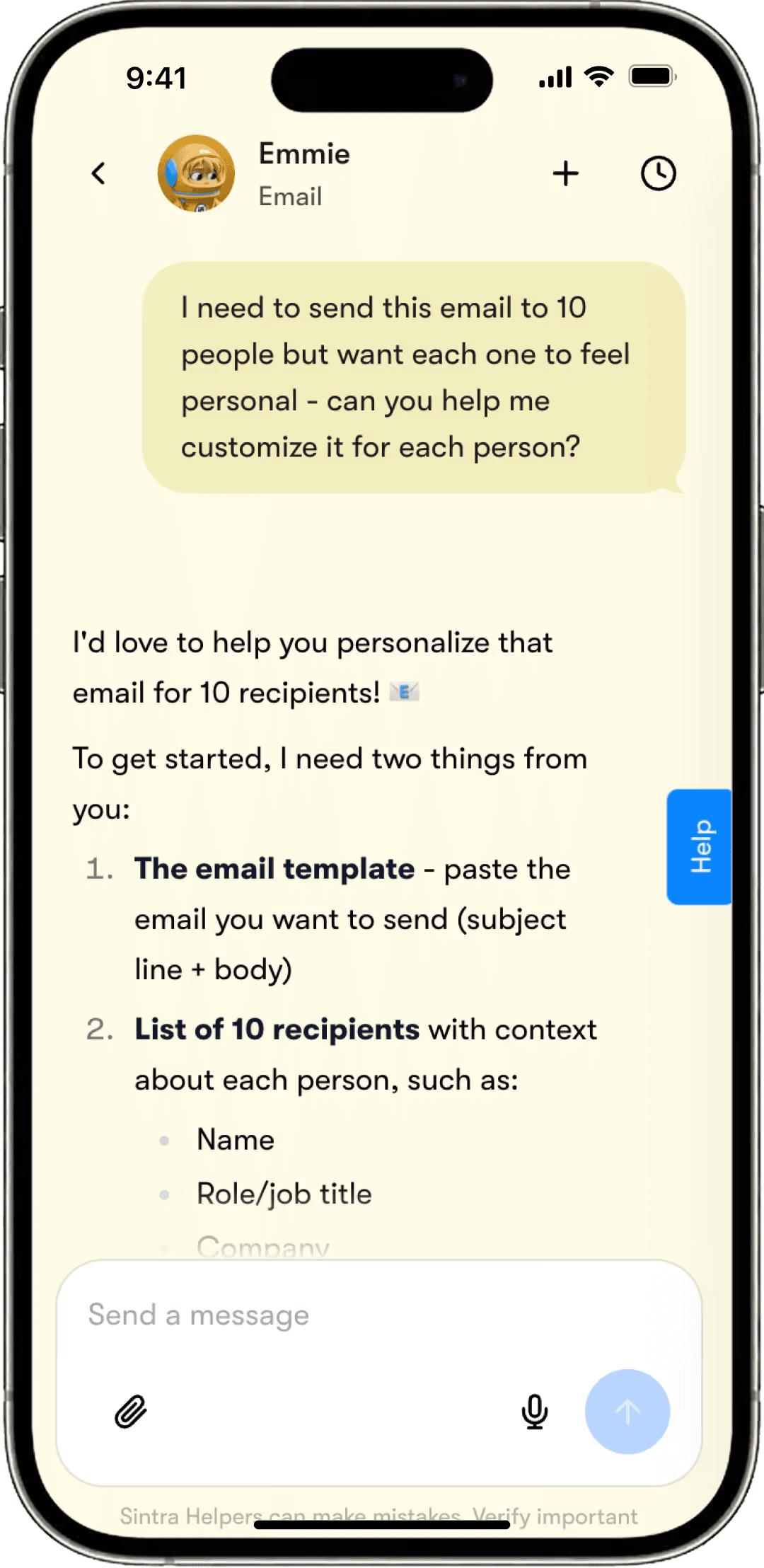 Emmie can loop in other helpers for research, copy refinement, or analysis behind the scenes.