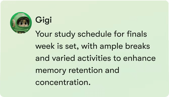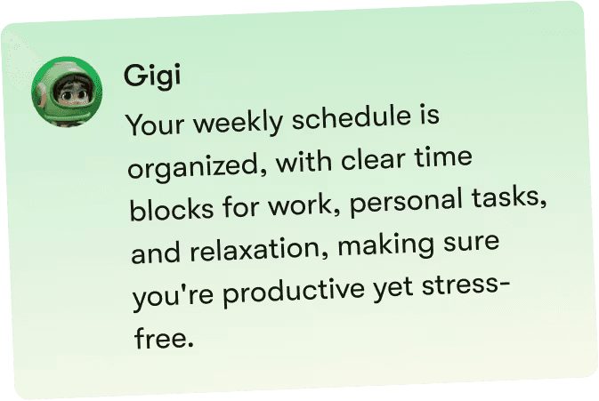 From daily tasks to long-term planning, Gigi helps you stay organized, focused, and in control. Our personal AI assistant is built to reduce mental load, not add more apps to manage.